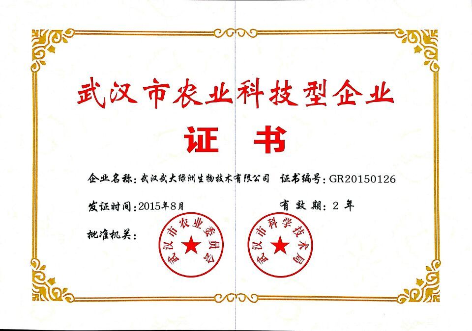 2015年8月6日,由武漢市農(nóng)業(yè)委員會(huì)、武漢市科學(xué)技術(shù)局組織專家評(píng)審和工作領(lǐng)導(dǎo)小組評(píng)選,湖北省入圍企業(yè)共計(jì)139家,武漢武大綠洲生物技術(shù)有限公司成功入選2015-2016年度武漢市農(nóng)業(yè)科技型企業(yè),為企...