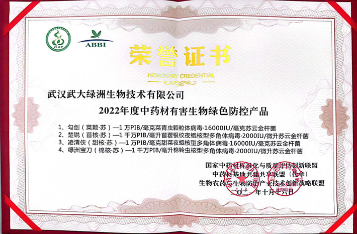國家中藥材標(biāo)準(zhǔn)化與質(zhì)量評估創(chuàng)新聯(lián)盟專家組給《2022年中藥材有害生物綠色防控產(chǎn)品核定目錄》企業(yè)頒發(fā)了榮譽(yù)證書,我司勾劍(菜顆·蘇)、楚銳(苜核·蘇)、凌清俠(甜核·蘇)和綠洲寶刀(棉核·蘇)四個產(chǎn)品入選2022年度中藥材有害生物綠色防控產(chǎn)品。