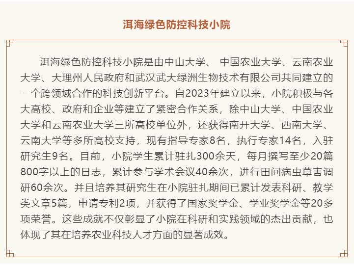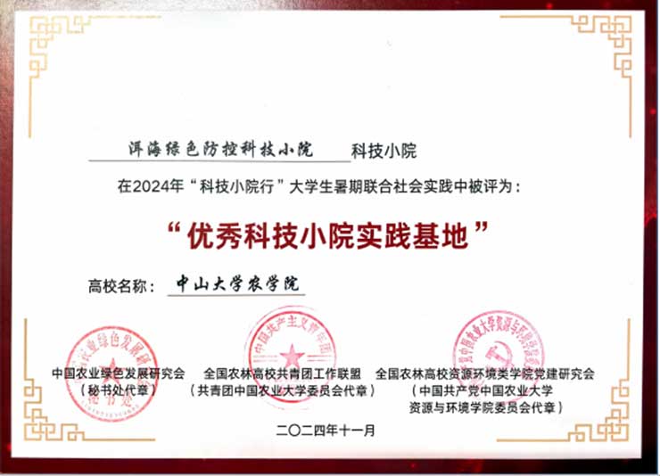 2024年11月,洱海綠色防控科技小院榮獲“優(yōu)秀科技小院實踐基地”的榮譽稱號,以表彰其在促進學(xué)生實踐教育和推動農(nóng)業(yè)科技創(chuàng)新方面的卓越貢獻!2024年7月,洱海綠色防控科技小院與賓川高原特色果蔬科技小院攜手云南農(nóng)業(yè)大學(xué),成功舉辦了“科技小院行”大學(xué)生暑期聯(lián)合社會實踐活動。在這次活動中,由中山大學(xué)、中國農(nóng)業(yè)大學(xué)、云南農(nóng)業(yè)大學(xué)、大理州人民政府和武漢武大綠洲生物技術(shù)有限公司共同建立的綠色防控科技小院為云南農(nóng)業(yè)大學(xué)資源與環(huán)境學(xué)院的狄義寧老師及其帶領(lǐng)的“‘農(nóng)’的傳人·青春實踐團”提供了悉心的幫助與支持,助力學(xué)生們圓滿完成了實踐活動。