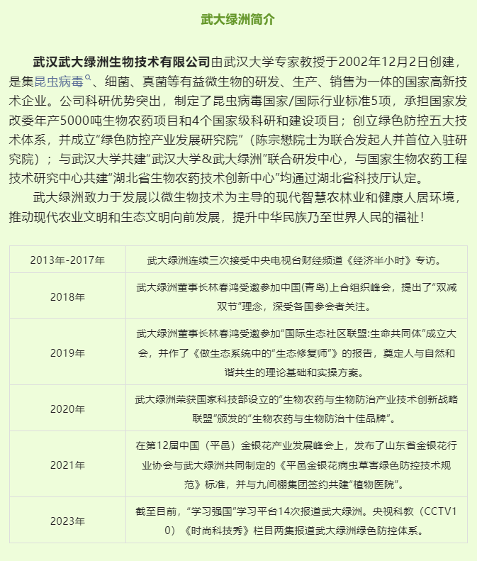 林博士帶領(lǐng)二位領(lǐng)導(dǎo)參觀了公司展廳,詳細(xì)介紹了武大綠洲公司理念、發(fā)展歷程以及以微生物技術(shù)為核心的綠色防控5+2體系,企業(yè)核心團(tuán)隊的榮譽(yù)資質(zhì),昆蟲病毒生物制劑產(chǎn)品以及智能霧森驅(qū)蚊系統(tǒng)及產(chǎn)品對生態(tài)環(huán)境的友好,能夠為廣大人民的健康著想,所以值得大力推廣和應(yīng)用。