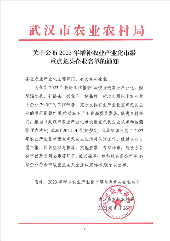 據(jù)武漢市農(nóng)業(yè)農(nóng)村局通知,武漢楚強(qiáng)生物科技有限公司入選2023年農(nóng)業(yè)產(chǎn)業(yè)化市級(jí)重點(diǎn)龍頭企業(yè)名單。